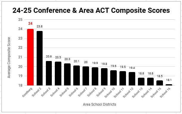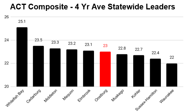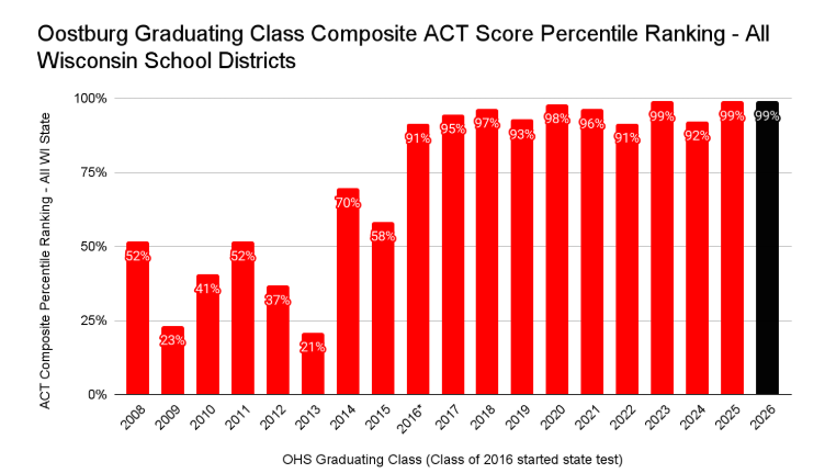 We believe that consistent results over time are an important consideration when evaluating our academic impact. We recognize that some schools move in and out of Wisconsin’s top rankings depending on the makeup of a particular class. We take pride in the fact that Oostburg has consistently placed in the top 10. (Click on graphs to enlarge) We believe this affirms the strength of our systems, the commitment of our staff, and the investments made by our community as we all work together to ensure high levels of learning for the next generation. |